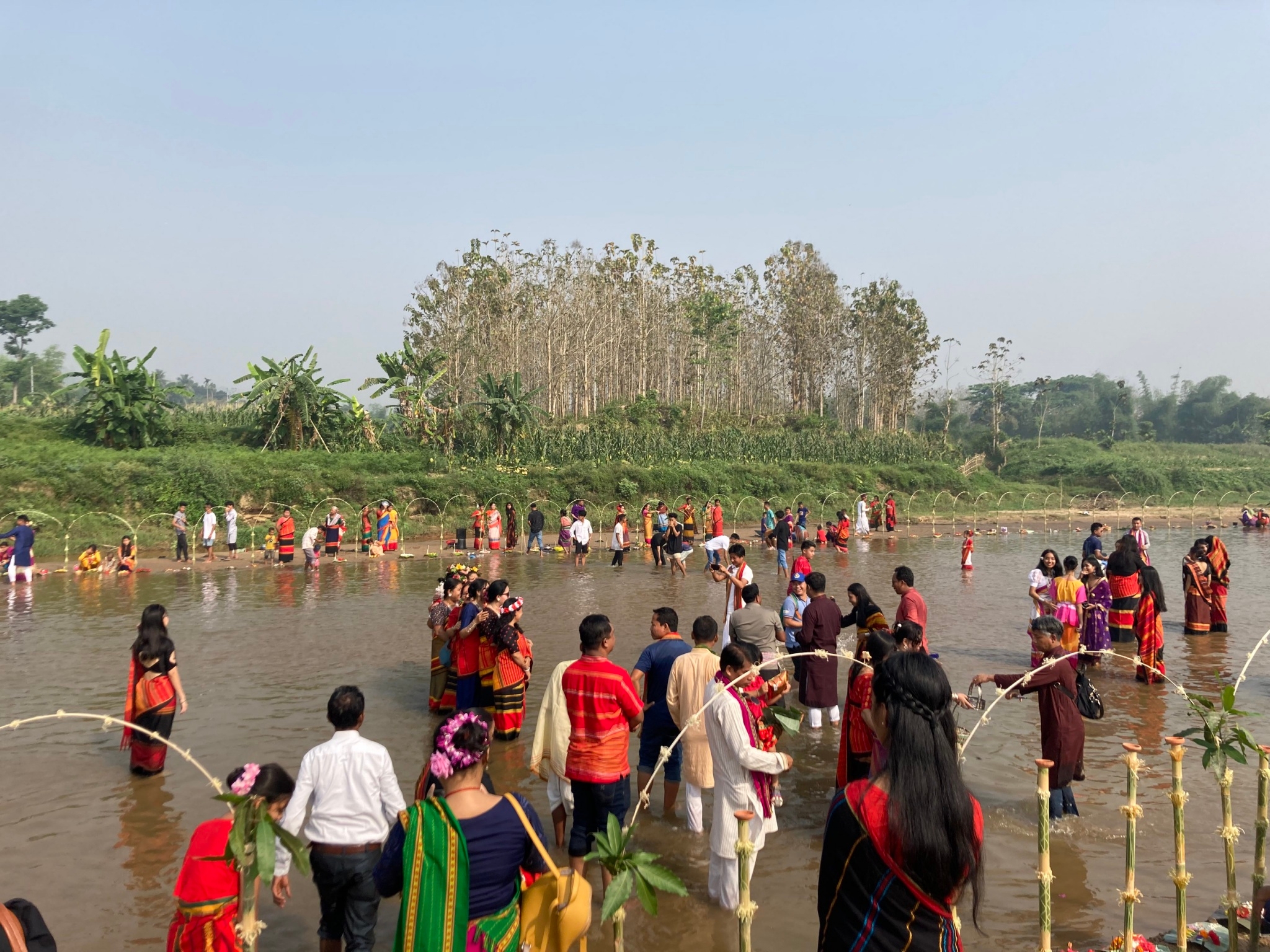 正月に川辺に集まる人々