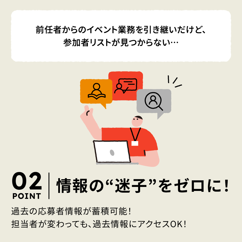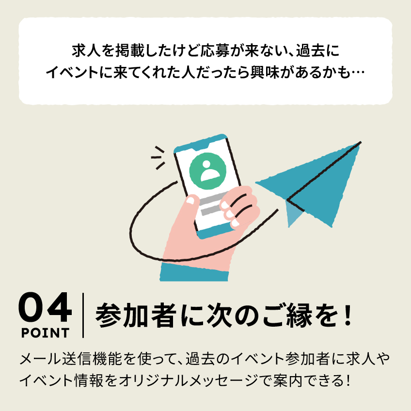 Web応募機能を使ったイベントは団体マイページで管理できます。過去の応募情報が蓄積されるので、以前応募してくれた方々に新しいイベントや求人情報のご案内もスムーズにできます。
