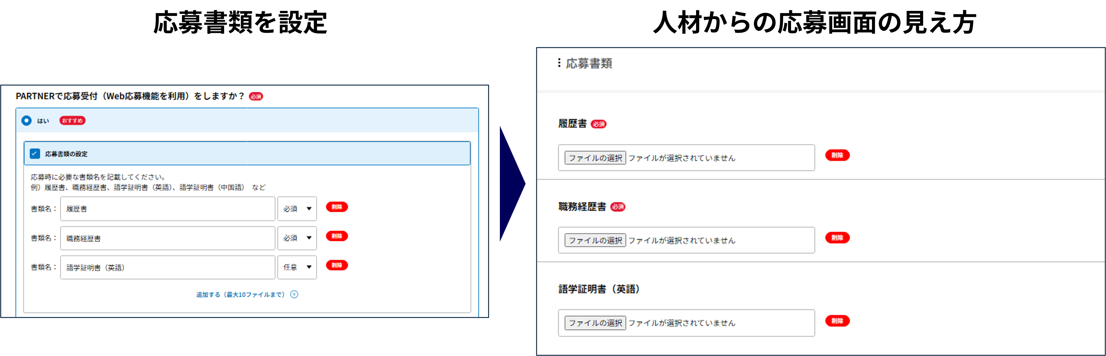 「Web応募のアップロード書類を設定する」で提出書類の指定が可能。最大10件もの書類添付が可能で、必須/任意も選べます。