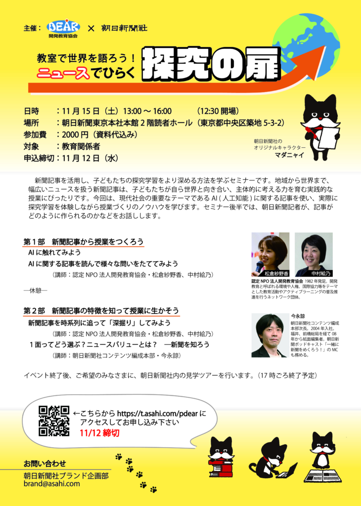 朝日新聞社と認定NPO法人開発教育協会(DEAR)が共催する教育関係者向けセミナーを開催します。
